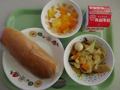 ミルクパン、牛乳、八宝菜、フルーツ杏仁
