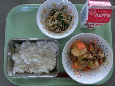 麦ごはん、牛乳、肉じゃが、ごま和え