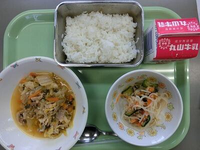 今日は、卯の花いりがでました。大豆を水につけて、十分柔らかくし、すりつぶして水を加えて加熱します。これを袋に入れて絞ったものは豆乳です。その豆乳を固めたものが豆腐で、袋に残した物を「卯の花」と言います。あまり食べたことのない子どもたちだったようです。ごちそうさまでした。
