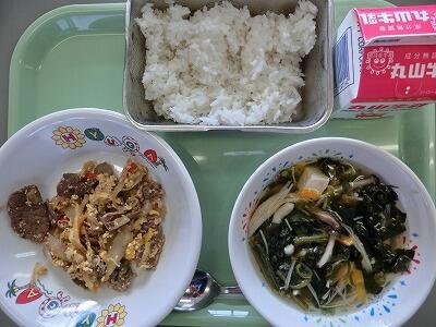 おいしさギューッ丼、牛乳、きのこ汁