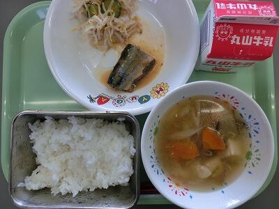 ごはん、牛乳、さんまのゆずみそ煮、もやしの和え物、のっぺい汁