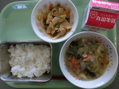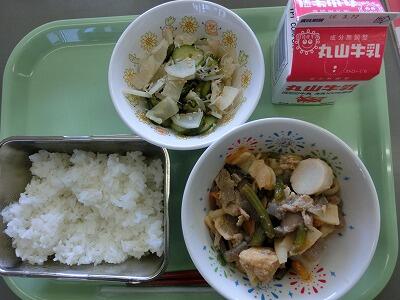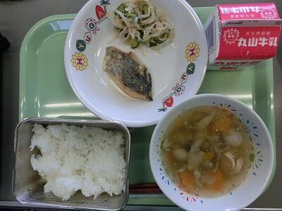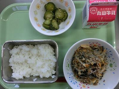 今日は「じゃこ和え」でした。じゃことは「ちりめん」のことで、生ちりめんを湯がいて乾燥させたものです。ちりめんはいわしの稚魚です。ちりめんのような小魚は、魚を一匹食べることになるので、成長期の子どもたちに必要なカルシウムをたくさん摂ることができます。おいしくいただきました。ごちそうさまでした。