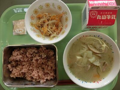 赤飯、牛乳、豚汁、梅和え、ごま塩