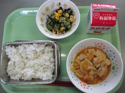 鶏肉の甘酢いためは、酢豚のような甘酸っぱい味付けで、ご飯がすすみました。旬のたけのこは最近、給食でよく登場します。季節を感じる給食で、児童も職員も大喜びです。今日もおいしくいただきました。