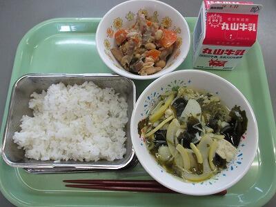 ごもく豆には、大豆やごぼう、れんこんなどたくさんの野菜が入っていて、いろいろな歯ごたえを楽しむことができました。わかたけ汁のたけのこは春を感じましたよ。今日もおいしくいただきました。
