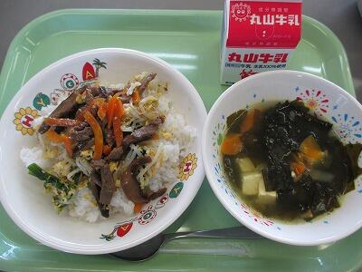 今日のビビンバは、別々に来た具材(甘辛く煮た牛肉と椎茸・ゆで野菜と卵)を自分でお皿の中で混ぜて食べるものでした。給食当番がつぎ分けるのは大変でしたが、低学年もなんとか混ぜて食べることができました。今日もおいしくいただきました。