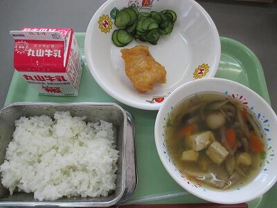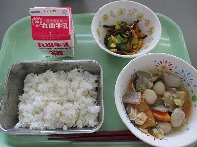ごはん 牛乳 鶏肉のへベス煮 きゅうりの塩もみ けんちん汁