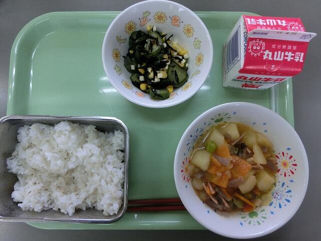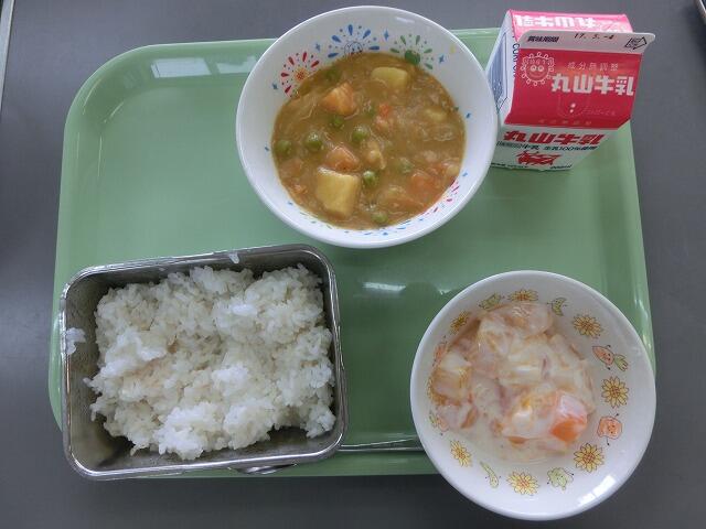 今日の給食は、児童たちの人気メニューでもあるカレーとフルーツヨー