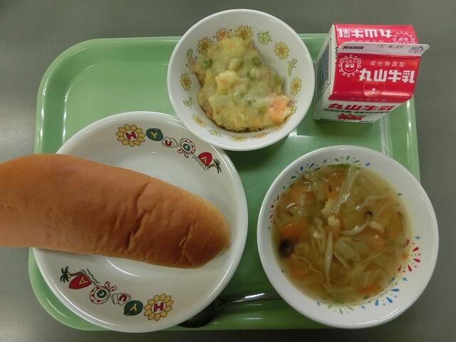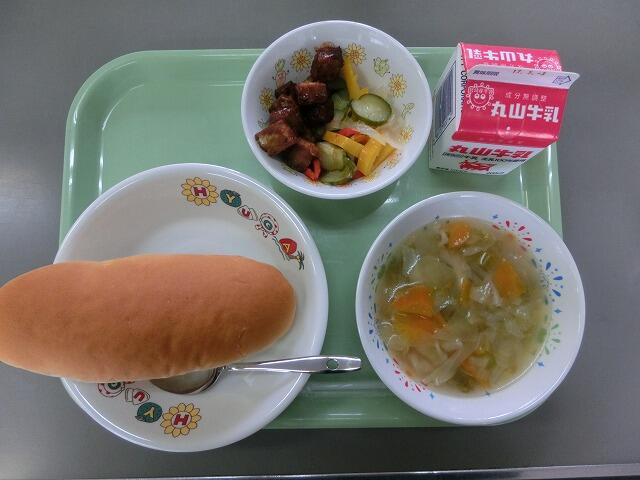 黒糖パン 牛乳 リヨネーズポテト 野菜スープ