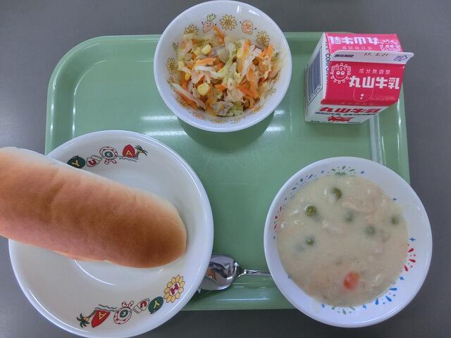 今日の給食は、とろとろのクリームシチューでした。子ども達の中には、