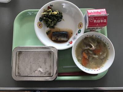 ご飯 牛乳 さんまの生姜煮 小松菜の胡麻和え 豚汁