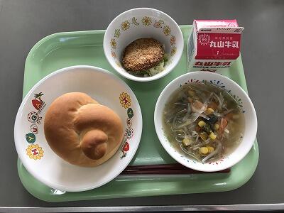 黒糖パン 牛乳 ごぼうのメンチカツ ブロッコリー 野菜スープ