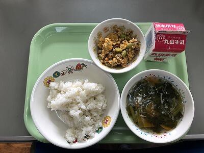 今日は、甘い味付けのそぼろ丼でした。そぼろは、ミンチと枝豆、卵が入っていて、彩りがきれいでした。子ども達もほとんど残さず食べていました。今日もおいしくいただきました。