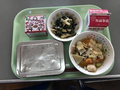 今日は、レンコンや人参、たけのこ、鶏肉のつくねが入った体が温まる煮物と子ども達がとても楽しみにしていたクリスマスケーキでした。笑顔いっぱいの給食になりました!!