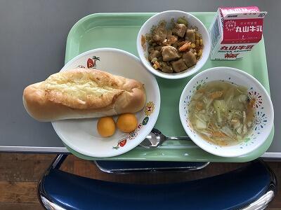 マヨネーズパン 牛乳 高野豆腐とカシューナッツの揚げ煮 野菜スープ きんかん