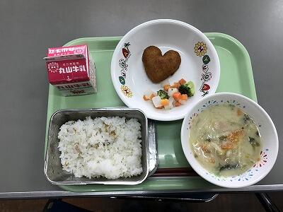 麦ごはん 牛乳 ハートのコロッケ ご汁