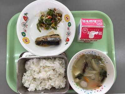 麦ごはん 牛乳 いわし梅煮 ピーマンの塩昆布あえ みそけんちん汁