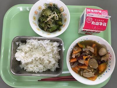 今日は野菜たっぷりで色どりの良い献立でした。体が強くなりそうなほうれん草サラダも、食べやすい味付けでペロリと食べてしまいました。今日はとても暑い日でしたが、給食を食べた後も元気いっぱい外で遊ぶ児童がたくさんいました。今日も美味しく頂きました。