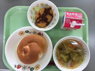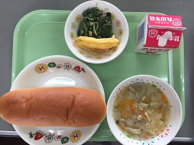 黒糖パン 牛乳 オムレツ ほうれん草のサラダ 野菜スープ
