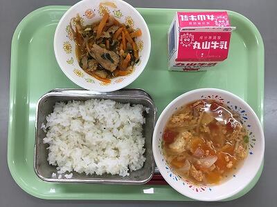 麦ごはん 牛乳 豚肉のスタミナ炒め トマトと卵のスープ