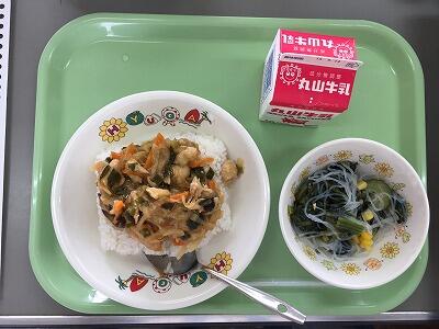 今日は朝から全校体育で運動会の練習がありました。暑い中で体を動かし、大きな声を出していると、体力も奪われていきます。朝ご飯はもちろんのこと、給食でもしっかりエネルギーを蓄えて、丈夫な体を作っていきたいですね。今日は、スタミナをつけてくれるにらの入った「とりにら丼」でした。今日もごちそう様でした。