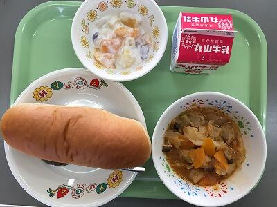 黒糖パン 牛乳 ミートボールのトマト煮込み フルーツヨーグルト