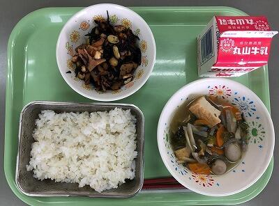 麦ごはん 牛乳 ひじきの炒り煮 鶏ごぼう汁