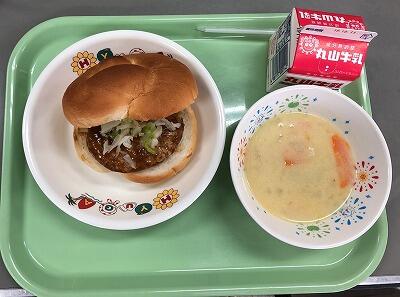 バーガーパン 牛乳 ハンバーグソースかけ キャベツ パンプキンチャウダー