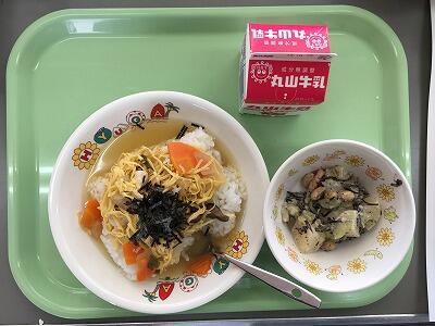 今日はゆかりふりかけがついていました。日向産のお米にしそ味のふりかけがあるだけで、いつもよりさらにご飯が進みそうでした。栄養のある豆や小松菜などの野菜もたくさん摂れる献立で、今日も美味しく頂きました。