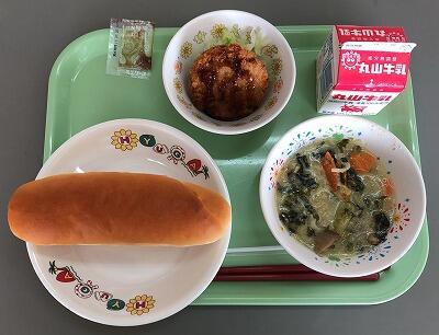 減量チーズパン 牛乳 黒豚メンチカツ せんキャベツ ひむかスープ 一食ソース