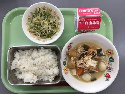 麦ご飯 牛乳 鶏肉と里芋のみそ煮 ほうれん草のごま和え