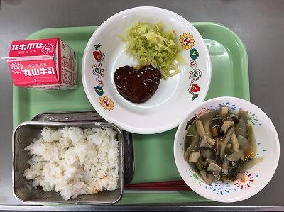麦ご飯 牛乳 ハートのハンバーグ せんキャベツ 根菜汁