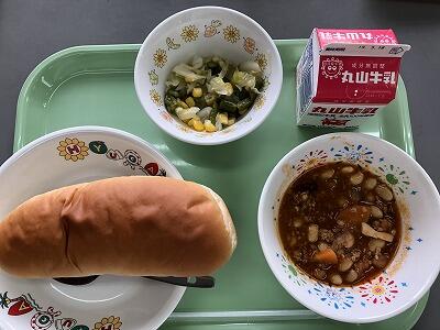 今日の給食は、チーズパンに牛乳、イワシのトマト煮でカルシウムとビタミンがたっぷりで栄養のバランスが感じられました。