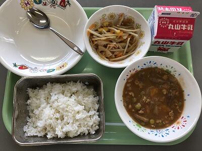 野菜のカレー煮 ひじきのサラダ コッペパン 牛乳