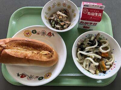 ごもくうどん 千切大根のサラダ 減量マヨネーズパン 牛乳