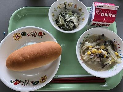ラーメン 小松菜のシャキシャキサラダ 減量コッペパン 牛乳