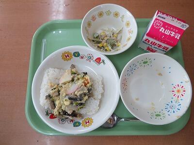 日本には、ごはんの上におかずをのせたり、かけたりして食べる「どんぶりもの」といわれる料理がたくさんあります。カツ丼、天丼、牛丼、親子丼などがありますね。このようにごはんの上に具をのせて食べるものを「飾り飯」といい、これは室町時代に考え出されたと言われています。この飾り飯は、お客様や遠い旅から帰ってきた人を迎えるときのおもてなしの食事としてよく出されたそうです。今日は他人丼でした。鶏肉と卵が親子なら、豚肉と卵は他人と言うことでこの名前がついたと言われています。