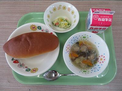 にくだんごのスープに カラフルサラダ こくとうパン ぎゅうにゅう
