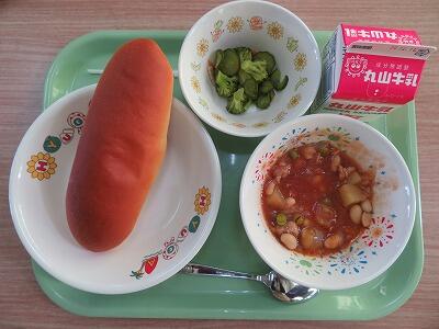 だいずのケチャップ煮 フレンチサラダ チーズパン ぎゅうにゅう