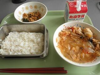 17日の献立 麦ごはん 牛乳 鶏肉のスタミナ炒め トマトと卵のスープ