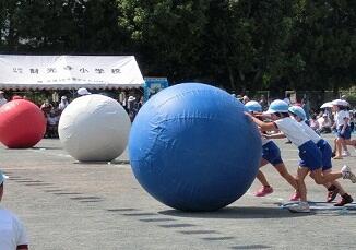 2年生は団技「大玉転がし」、表現「花咲きポプラ」のダンスを、