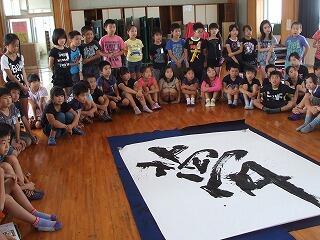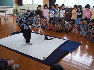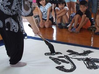 書道家の今村先生に来ていただいて、書道パフォーマンスを見た後、筆の持ち方の基本を一人一人丁寧に指導していただきました。