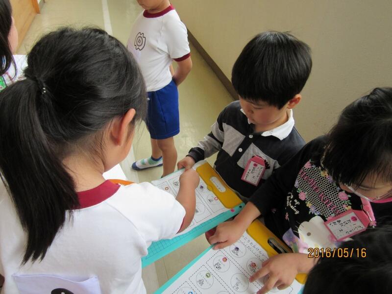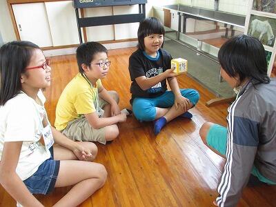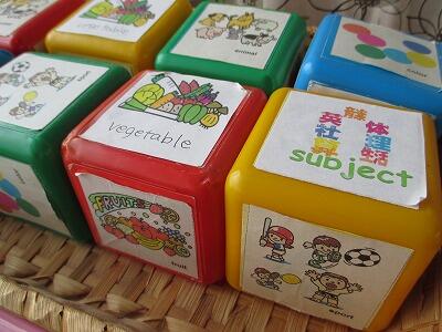 サイコロの6面に、Animal(動物)、fruits(果物)、Subject(教科)、Sports(スポーツ)、Vegetable(野菜)、color(色)の6つのテーマが書かれています。グループの中で順番にサイコロを振り"What ~ do you like?"と質問しながら英語で話を広げていくというものです。ジェスチャーを使いながら、楽しく会話ができました。