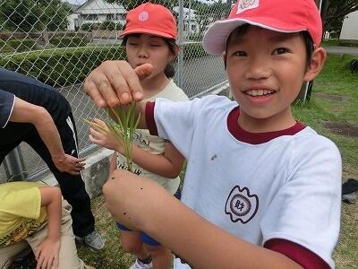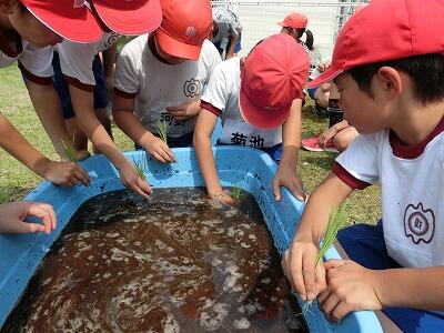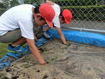 2回目とあって、子どもたちの準備は手際よく、苗が浮いてこないように、しっかりと土の中へ植えることができました。