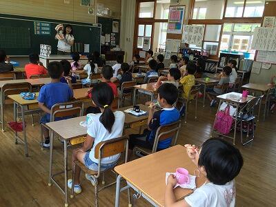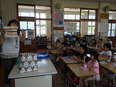 給食の後、保健室の先生が各学級を回って、正しい歯ブラシの持ち方やじょうずな歯の磨き方を教えてくださっています。