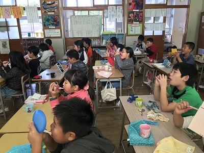 11月16日(木)に4年生は、歯のブラッシング指導を行いました。歯垢染色剤を使用して、磨き残しがある部分を確認しながら、正しい歯みがきの仕方について、学習しました。歯と歯の間や歯と歯ぐきの境目、奥歯に磨き残しが多いということに気付き、そこをきれいに磨くことができました。学校歯科医の田村歯科医院の歯科衛生士さん3名に来校していただき、丁寧なご指導をしていただきました。ありがとうございました。今回、学習した歯みがきをこれからも実践し、むし歯ゼロを目指してほしいです。