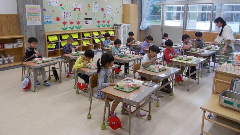 今日から1年生の給食がスタートしました。 小学校生活で初めてとなる記念すべき最初のメニューは、「ごはん、ハンバーグ、コーンスープ、牛乳」でした。準備の時間には、5・6年生のお兄さん、お姉さんたちが給食当番としてお手伝いに来てくれました。準備が整い「いただきます!」の合図で食べ始めると、教室中が笑顔に。「おいしい!」という声があちこちから聞こえ、みんな元気いっぱいに食べていました。