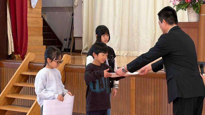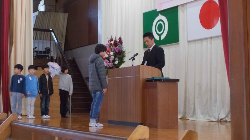 校長からは、今年度のキーワードとして大切にしてきた「命」「思いやり」「感謝」についての話がありました。「あたりまえ」ではなく「ありがとう」の心をもつ話がありました。続いて生徒指導主事からは、安全で充実した春休みを過ごすための心得について指導があり、子どもたちは真剣な表情で聞いていました。式の後に、作品展で入賞した児童の表彰を行い、拍手で讃え合いました。