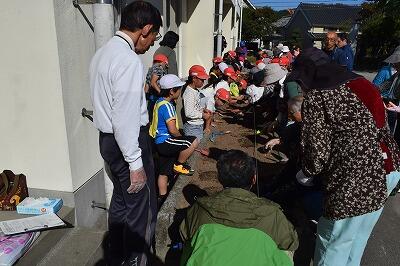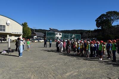 姿勢を低くして頭を守る、揺れがおさまったら運動場に集まる、津波に備えて高台に避難するという流れで訓練を行いました。避難の仕方については概ね身に付いていましたが、集団行動や誘導等にいくつか課題も見つかりました。