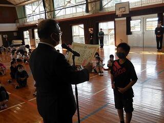 その後、給食作品コンクールで、最優秀賞と入賞が1名ずつ表彰されました。おめでとうございます。